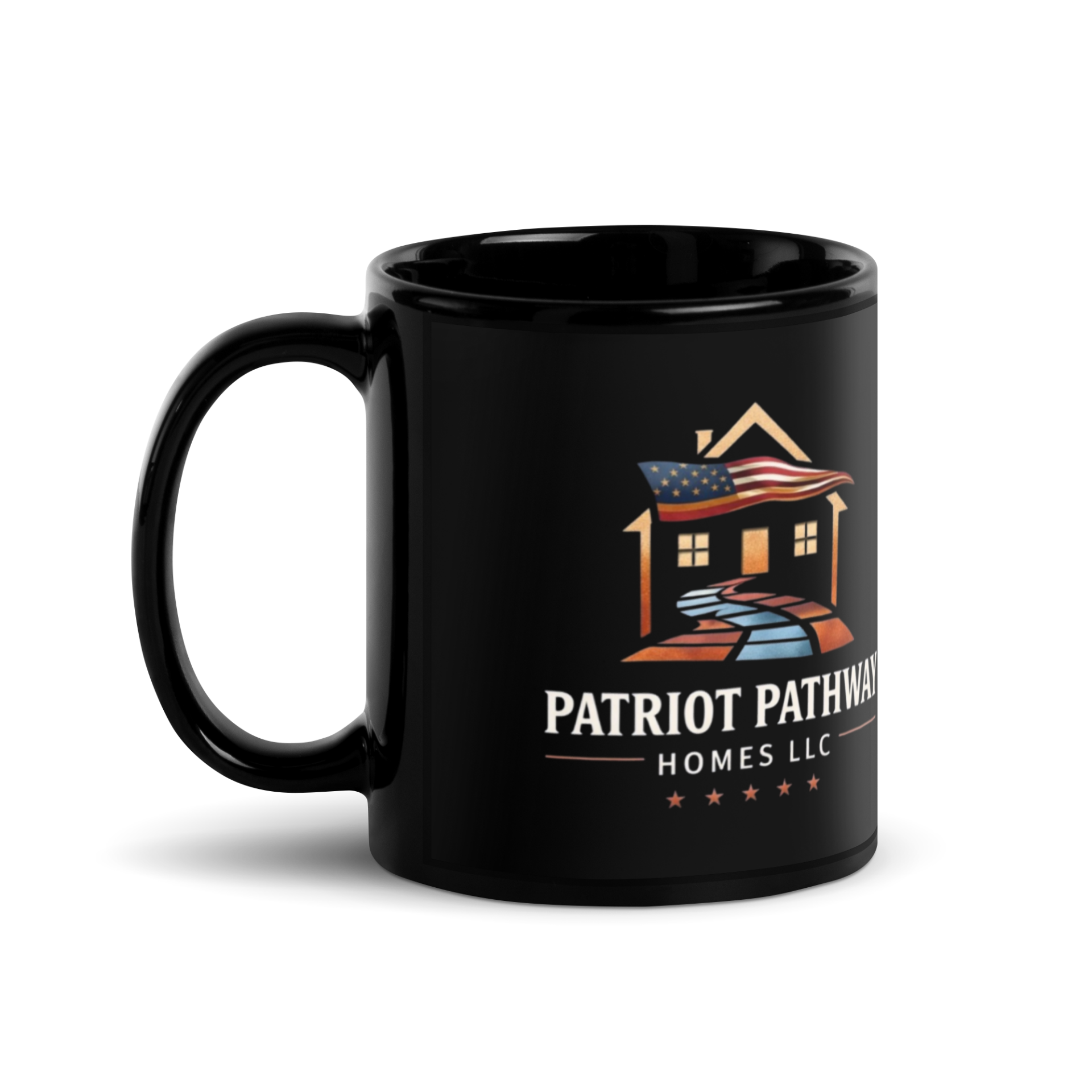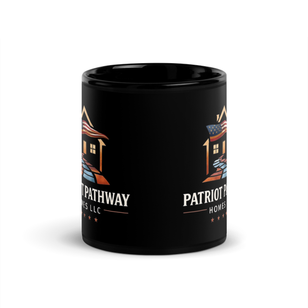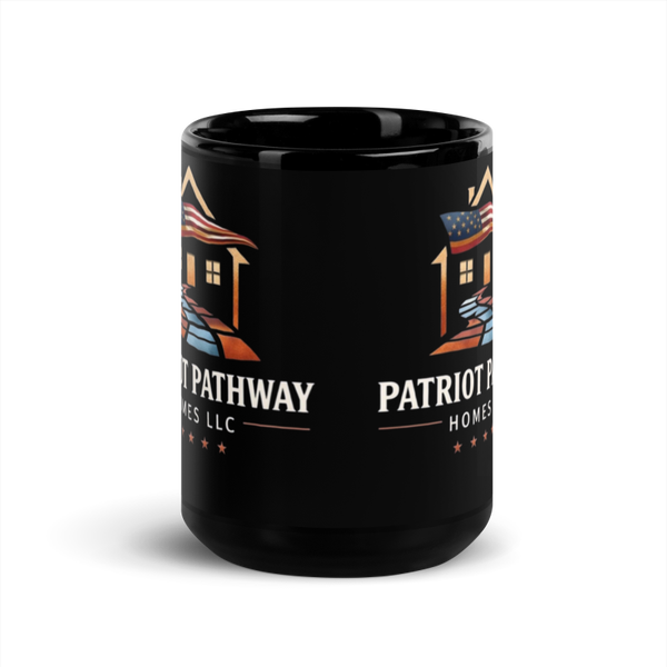 Our Patriot Pathway Homes black ceramic mug is sturdy, sleek, and perfect for your morning java or afternoon tea.